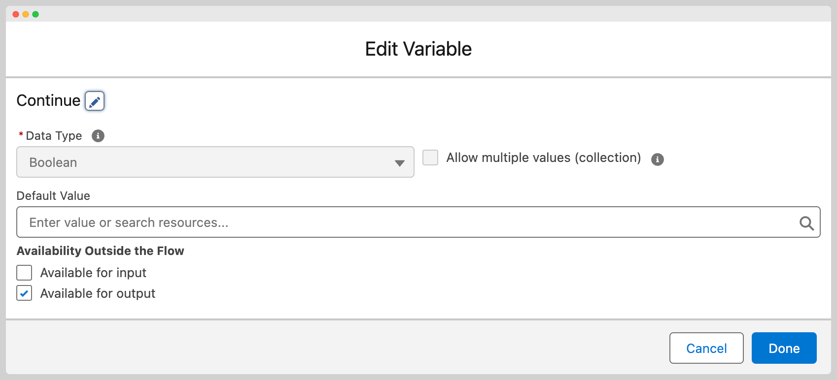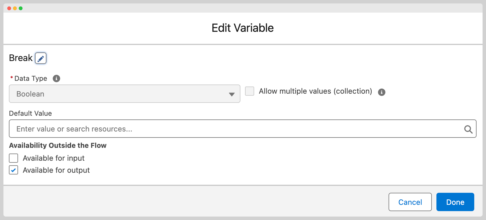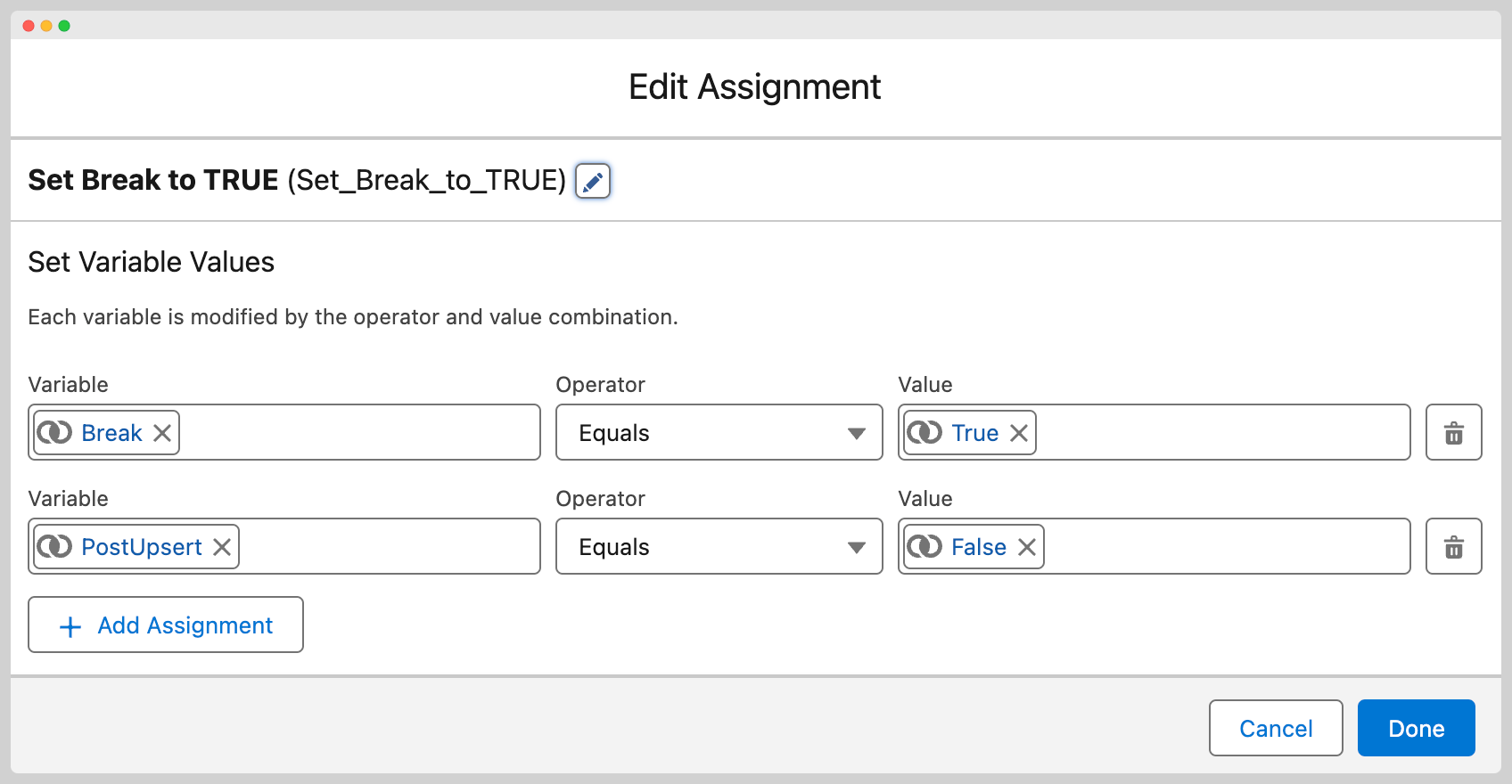 If you wish to use a “Break” or “Continue” command but also want the Post-Upsert action for the phase to run, then create an output-enabled Boolean variable named PostUpsert and set it to true.