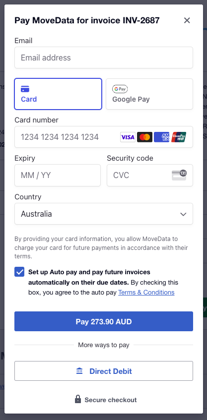 Enter your card details and ensure you select Set up Auto pay and pay future invoices automatically on their due dates before making payment.
