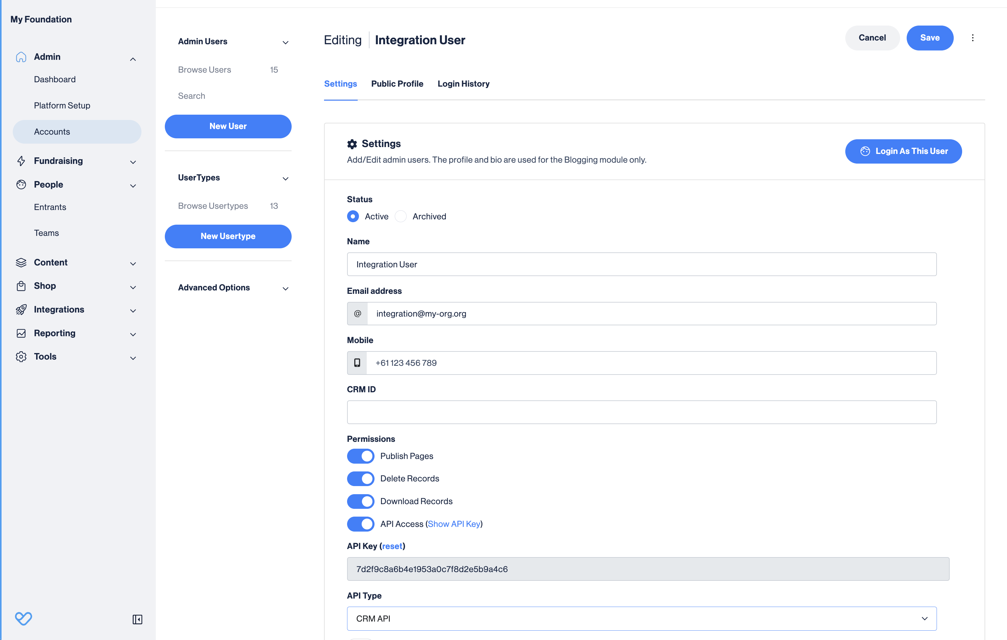 https://fundraise.your-organisation.org/management) - Open the user your wish to user for the integration by selecting Admin → Accounts